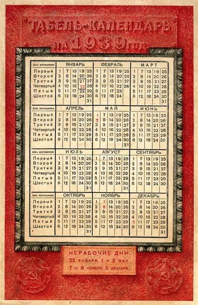 Están señalados como festivos (en rojo) el 22 de enero (muerte de Lenin), el 1 y 2 mayo (días del trabajador), el 7 y 8 de noviembre (revolución proletaria) y el 5 de diciembre (día de la Constitución).